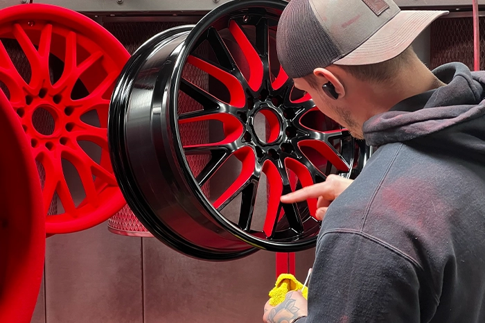 Dinged wheels or raw metal parts get new life here. We electro-spray powder and cure it in an industrial oven for a finish tougher than paint.