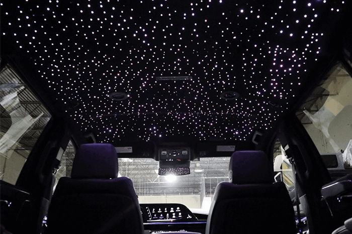 We embed hundreds (or thousands) of fiber-optic LEDs in your headliner with custom patterns, color-changing modes, and effects controlled right from an app.
